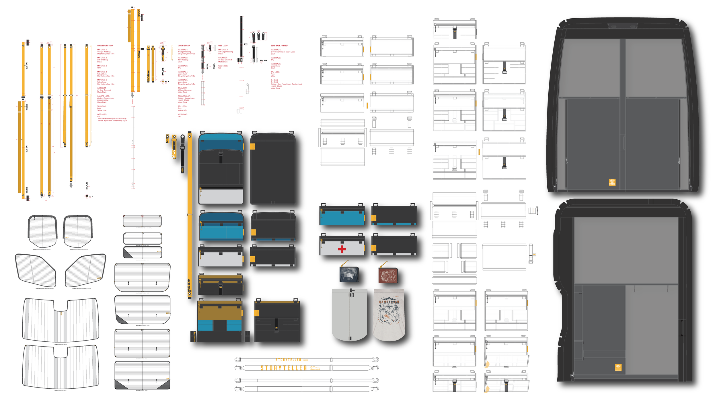 The off-the-wall crew at Storyteller Overland are mad geniuses when it comes to off-road vehicle conversions… until it comes to soft goods. By their own admission, it just wasn’t their specialty. I gladly stepped in and brought my expertise in outdoor accessory design to a range of cut-and-sew products used in and with their vans: bug screens constructed like lightweight tents, insulated puffy window shades, modular gear organizers and straps, and more.